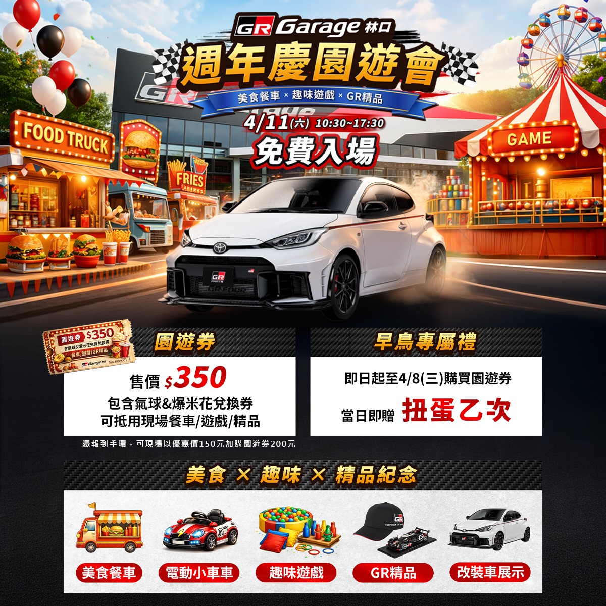 美食餐車、趣味遊戲 (遊戲人人有獎!)、電動小車、GR風格好物、車輛展示,吃、玩、逛一次滿足!